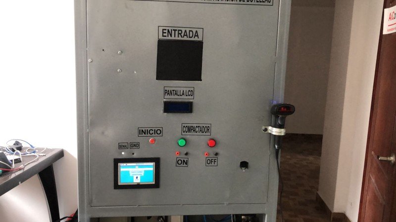 Lector codigo de barras para la lectura de las botellas, Raspberry con pantalla LCD para la programacion de los sieguientes equipos y pantalla para la visualizacion de cada procedimiento, dos electrovalbulas para la compuerta de ingreso de la botella, y para el sistema compactador de botellas y un sistema de entrega de monedas.